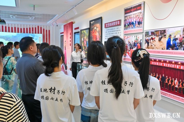 图为实践团成员在百坭村黄文秀先进事迹展览馆跟随讲解员一共参观了解黄文秀优秀事迹。李莹莹 供图