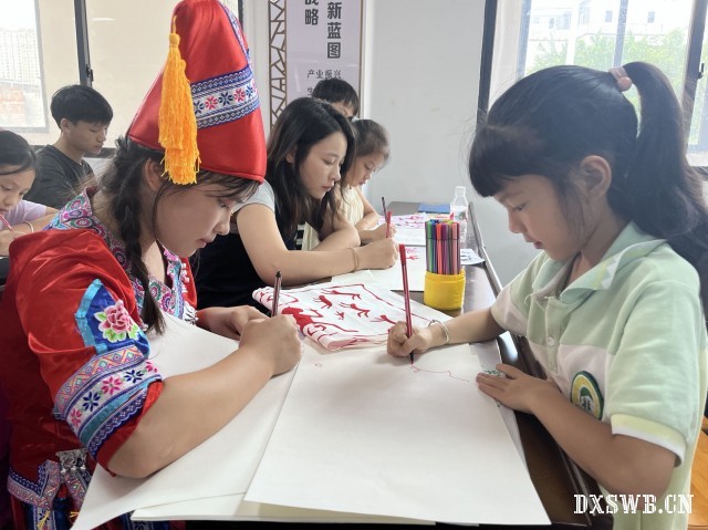 实践队成员指导小朋友绘画花山岩画图。大学生网报通讯员蒲晓龙供图