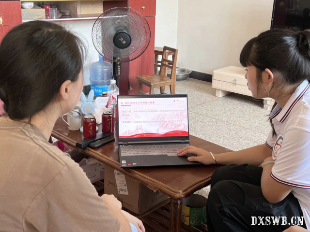图为“信之助”团队成员向受访学生家长讲解国家资助政策。大学生网报通讯员赵武雷摄