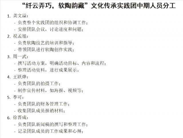 “纤云弄巧,软陶韵藏”实践团在本次实践中着力创新发展互联网时代背景下“学习+走访+总结+传承”四合一的研学方式。将传统非遗文化在新时代赋予新气象,不仅需要新的方式方法,更需要当代非遗传承人的敢作敢为。实践团成员在活动开展中充分发扬河海精神,践行河海校训,推动在本次实践的顺利开展。
