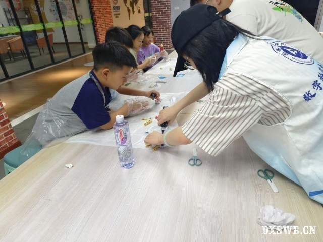 图为实践队员协助小朋友们完成蓝印花布的制作,感受非遗魅力。郑子晔 供图