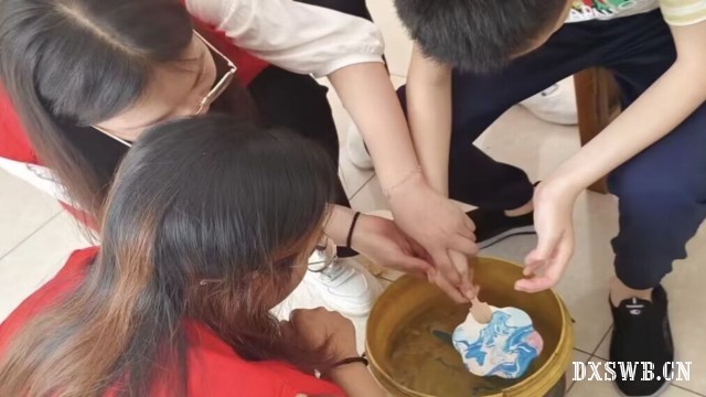 为架起与孤独症儿童沟通的桥梁,进一步促进孤独症儿童真实情感的流露,志愿团队在第二天开设了扎染课。在扎染活动开始前,由于团队大多数成员从未接触过扎染,不知道明确的步骤,团队的队长为了让课程更加有趣味与有序,让团队成员通过一个关于扎染详细步骤的视频来进行初步的学习。在进行活动前,团队队长带领团队志愿者们预演了一遍,再确认流程顺利的情况下,志愿团队为孩子们开展了本次扎染课。在扎染活动开始后,志愿者主持人耐心地向孩子们讲述步骤,接着他进行了示范,孩子们被他的扎染示范深深的吸引住,迫不及待的进行扎染。在志愿者主持人说开始扎染之后,其他志愿者助教和学校老师在孩子们身旁帮助他们一步一步进行扎染。在活动结束后,孩子们兴奋的展示了自己的作品,他们用自己的双手,创造出了属于他们的艺术品。