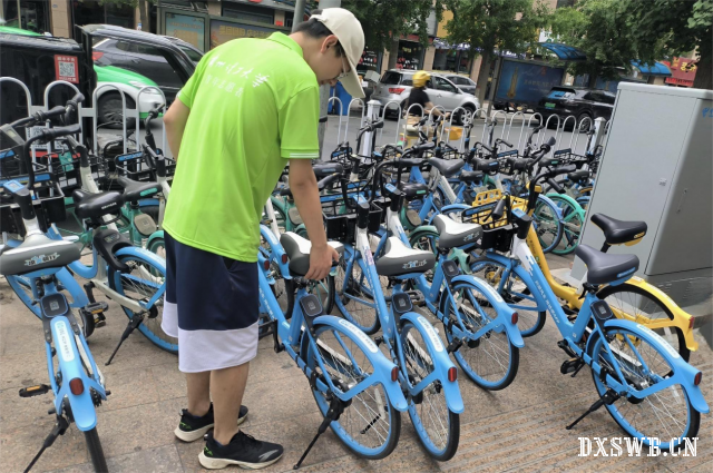 图为实践队员整理占用盲道上的自行车。通讯员 刘朗 供图