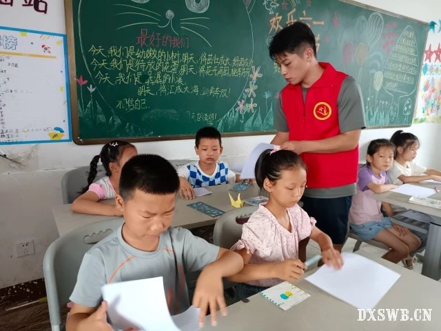 纸飞机,一种源自童年的简单游戏,却承载着无数人的梦想与回忆。它用最普通的纸张,通过简单的折叠,变成了能够飞向蓝天的“飞机”。在这个过程中,"纸翼轻扬"不仅是对纸飞机飞行动作的描述,更是对孩子们心中那份纯真梦想的象征。为了让同学们放飞梦想,湖北汽车工业学院科技学院青锋·星源志愿服务队的志愿者们于2024年7月13日在湖北省黄冈市红安县上新集镇董必武红军小学开展放飞梦想的活动。