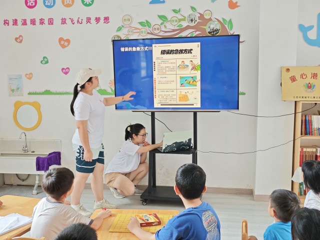 图为实践队成员讲解防溺水的急救方法并提醒孩子们不要使用错误的急救方法 。大学生网报通讯员 段佳琳 供图