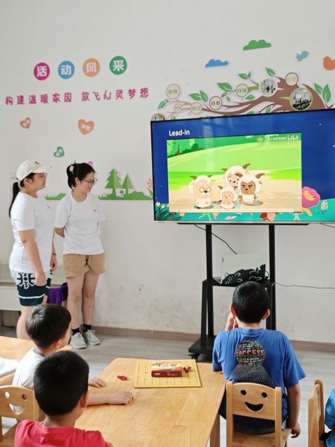 图为实践队成员播放防溺水有关的动画短片,调动孩子们的积极性。王子诺 供图