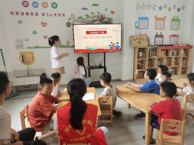 图为实践队成员开展“思想旗帜”主题专题教育,帮助孩子们了解国家的思想方针政策。王子诺 供图