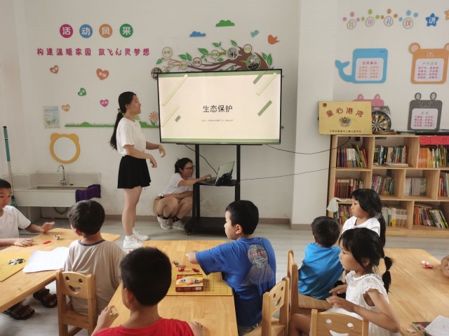 图为实践队成员进行生态保护主题宣讲并让孩子们思考生活中保护环境的例子。冯芸芸 供图