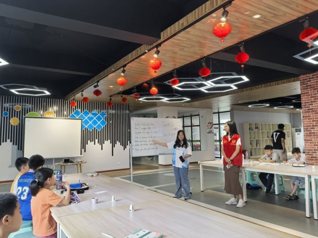 英语歌唱:为了对孩子们进行英语启蒙,志愿者们精心策划了英语歌唱环节。首先,志愿者通过逐句解析英语歌曲的歌词,不仅教授单词的含义,还结合生动有趣的例句帮助孩子们在语境中记忆单词,确保每位学生都能准确理解歌词内容。随后,采用分步教学法,志愿者耐心地引导孩子们跟读歌词,纠正发音,确保发音准确流畅。紧接着,通过节奏训练和旋律模仿,志愿者逐步带领孩子们学会歌曲的旋律与节奏,最终能够自信地完整演唱整首歌曲。