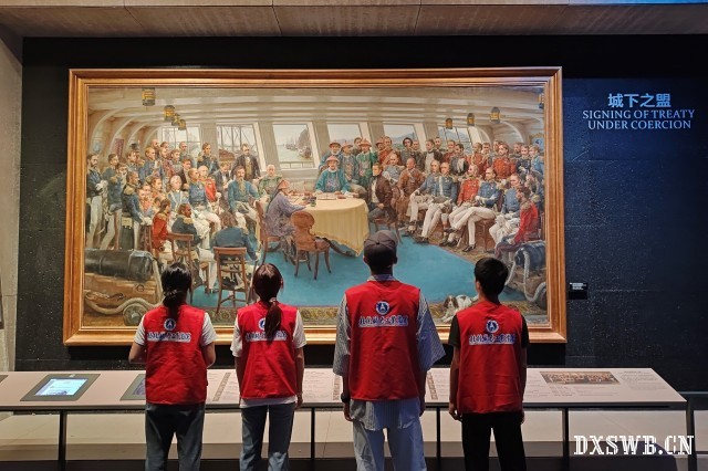 图为实验团队成员通过城下之盟图画直观感受当时我国对不平等条约签订时的忍受和西方国家的嚣张气焰。 通讯员 李达强 供图