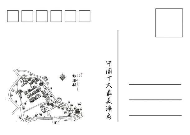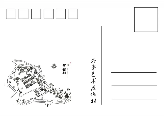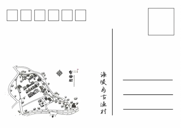 在指导老师的指导下,我们团队成员经过头脑风暴后设计出了具体的文创产品成稿,文创产品的设计结合了谷寮村当地的特色,以明信片形式来体现。明信片信封封面以米白色为底,包含有“谷寮村字样”“谷寮村地图”以及一个可以看到明信片的圆孔,明信片正面以摄影组拍摄的图片为主,背面印有“谷寮村地图”以及正面图片的标题。以下为我们团队的设计成果。