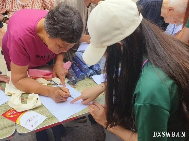 图为当地居民在等待填写调查问卷,实践团队成员正在积极宣传献血用血知识。大学生网报通讯员张浪