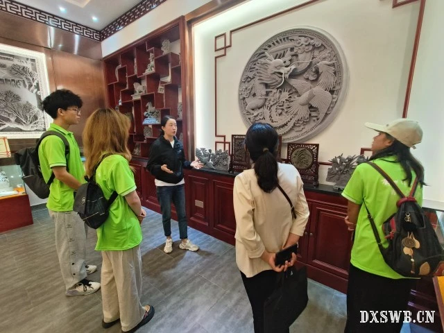 在现代砖雕艺术馆内,队员们被一幅幅精美绝伦的砖雕作品深深吸引。其中最令人震撼的是那幅由50多块青砖拼接而成的《清明上河图》巨幅砖雕,这幅作品层次分明、细节生动,仿佛带领观众穿越回了北宋时期的繁华都市,让人大饱眼福。公司的砖雕作品将传统国画、书房、印章、诗文等元素与砖雕艺术完美融合,同时还通过创新设计了非遗文创产品,如牡丹、玫瑰形态的砖雕摆件,花瓣层层叠叠,色泽鲜艳,仿佛能闻到花香,让人赞叹不已。