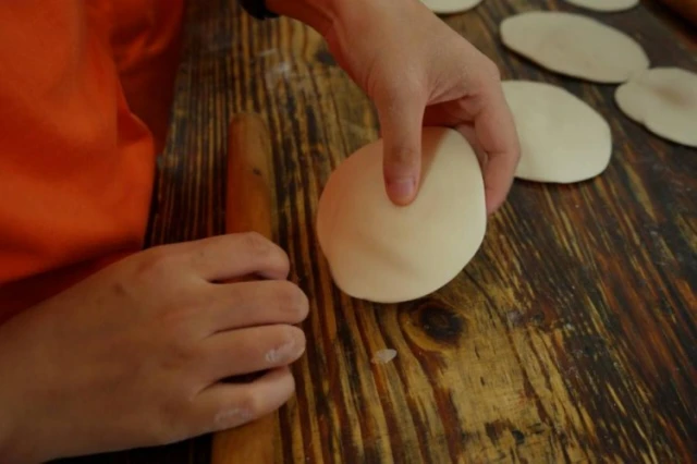 在擀面阶段,擀面工序对操作者的手法协调性提出更高要求。根据沙田包子"中间厚、边缘薄"的工艺标准,成员需在压圆面团后,通过擀面杖完成面皮延展。实践过程中,部分成员制作的面皮呈现不规则形态,凸显了非遗工艺的专业性与复杂性。