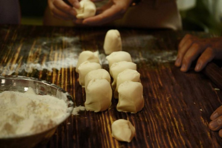 团队成员在三位师傅的专业指导下,学习了沙田包子制作工艺。作为面点制作的基础工序,搓条要求操作者凭借精准的手势控制与力度把握,使面团条体均匀成型。初次尝试时,部分成员因手法生疏,制作的面团出现中间粗两端细等情况。经过师傅的示范讲解,团队成员认识到,唯有通过反复练习形成肌肉记忆,方能达到理想效果。
