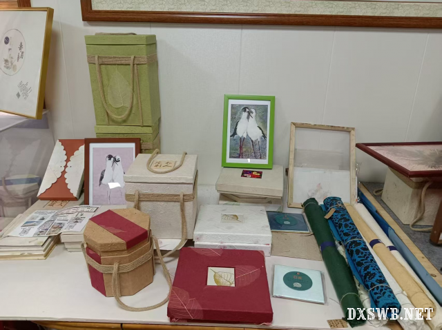 厅内,古法造纸文创产品形式丰富多样,不仅有描绘山水、花鸟、草木的精美画作,还有古色古香的宫灯、书灯,以及精致的明信片等。其中,由传承人王萌和曹俊峰分别创作的画作曾在粤港澳大湾区 “国匠杯” 等多个大型美术赛事中参与评比,斩获金奖、银奖、铜奖等优秀成绩,展现出曹氏古法造纸文创作品的卓越艺术水准。