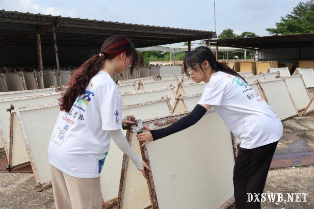 紧接着,考察队伍来到造纸工厂,近距离地观摩古法造纸的生产流程。调研组成员与工人深入交流,了解生产细节;其他成员则亲自成纸、晾纸、拆纸等生产工序中,亲身体验古法造纸的魅力。当面对 “这里的工作是否辛苦” 的提问,工人们纷纷表示乐在其中。