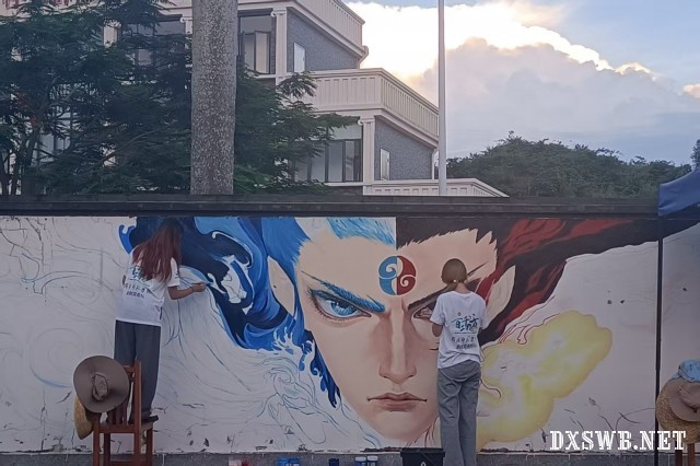 除青春主题墙绘外,启航突击队结合当代文化元素,选取热门动画电影《哪吒之魔童降世》中哪吒与敖丙并肩作战的经典画面进行创作。团队成员通过精准构图、细腻上色,将角色坚毅的神情、磅礴的气势生动呈现于墙面,既展现了当代青年对传统文化创新表达的探索,又赋予乡村文化新的活力。此举不仅吸引众多村民驻足欣赏,更成为青少年感受艺术魅力、传承文化精神的生动载体,让传统文化在新时代乡村焕发新光彩。