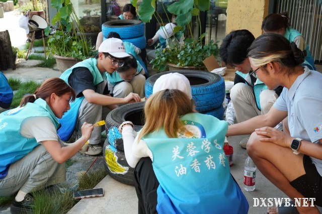 活动中,志愿者们收集废弃的轮胎,经过清洗、打磨后,以环保涂料为底色,结合乡村文化进行彩绘创作。原本斑驳的轮胎被赋予新生,变身为花盆和景观装饰,装点在房屋周边。