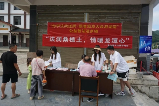 龙潭坪社区小组利用当地赶集日人流量大的特点,在集贸市场精心设置了“法润桑植土,情暖龙潭心”法律咨询台。实践队员们热情接待前来咨询的社区居民,就婚姻家庭、邻里纠纷、土地权益等与生活息息相关的法律问题提供免费的专业咨询和解答。同时,队员们积极宣传推介由湖南省司法厅与湖南省文化和旅游厅联合主办的“你学法我送票·跟着旅发大会游湖南”大型公益普法活动,鼓励群众参与学法。活动成效显著,累计发放各类普法宣传材料150余份,赠送法治主题小礼品70余份,现场接待法律咨询13人次,并对复杂法律问题进行了电话回访,还特别为几名未成年人普及了基础法律常识。