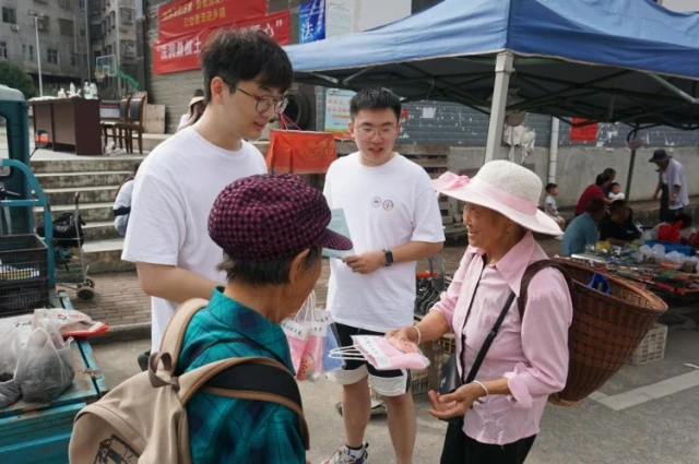 实践团成员发放活动宣传单与礼品