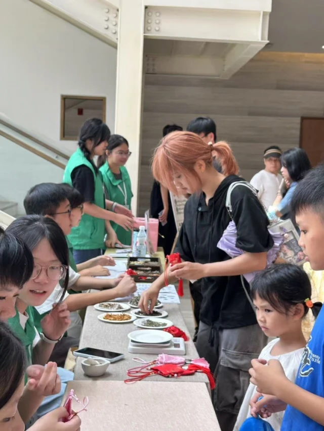活动期间,游客们纷纷化身为 “寻宝探险家”,全身心投入到这场充满挑战与乐趣的游戏中。馆内各处隐藏着大量问题卡片,参与者找到后,带着对问题的好奇去参观探索发现。当完成参观后,参与者可以回到二楼大堂互动区,向工作人员核对答案。在互动区,志愿者积极地向游客们讲解不同草药的用途,介绍各种香囊的不同功效与用法,指导游客们根据草药的种类与比例制作香囊。游客们不仅获得了精美香囊,更收获了各种草药知识,直道本次活动收获颇丰,不虚此行。