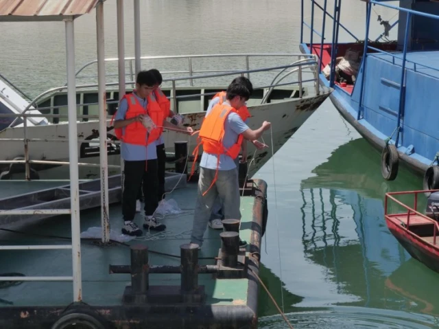 图为实践队员在宋岗码头收集水源样本。高原 摄