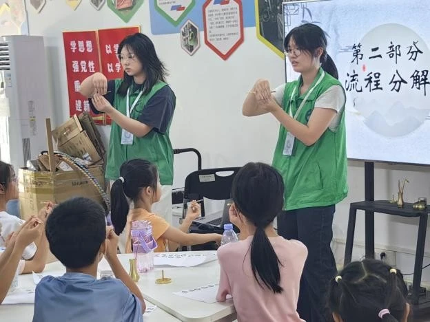 图为药传志愿服务队队员指导同学们共同学习篆香流程。通讯员 胡俊鹏 供图