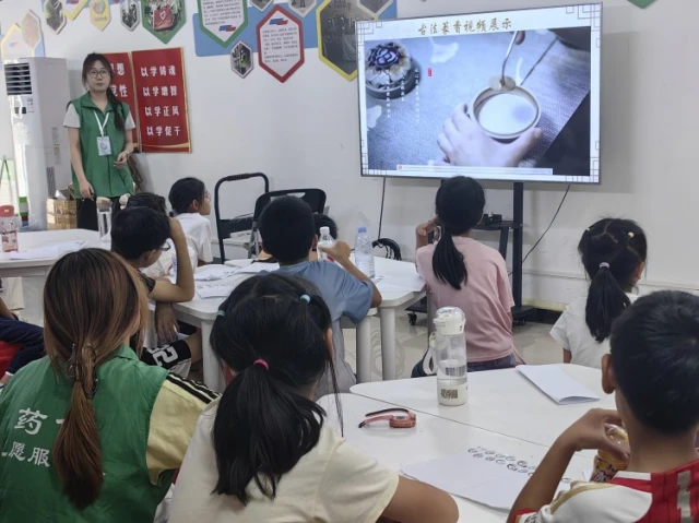 图为药传志愿服务队队员引导同学们展示所学的篆香流程。通讯员 胡俊鹏 供图
