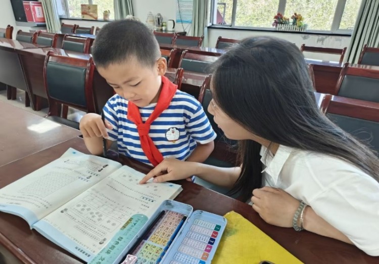 宣讲结束后,作业辅导环节随即开展。一年级区,队员陈伟洁用"小6是b、小9是d"的比喻帮学生区分拼音,并通过组词游戏强化生字记忆;二年级区,队员王新用"小帽子"标记法攻克进位加法易错点;三年级区,队长杨庆萱以画简图法解析"鸡兔同笼"问题,指导学生用"圈关键词"法完成阅读理解。成员们坚持"引导而非告知",助力学生自主攻克难题。