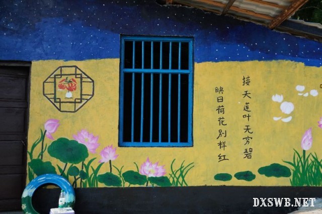 绘制现场,团队采用防水丙烯颜料与抗紫外线涂层技术,确保墙绘耐候性达5年以上。师生分工协作,完成民宿外墙创作。村民刘大姐看着渐成雏形的墙绘感叹:“以前墙面光秃秃的,现在画得这么漂亮,游客肯定会喜欢!”(图为文化墙部分呈现效果)