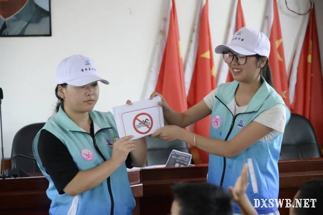 图为志愿服务团成员讲解防溺水标识。 宋云翔摄