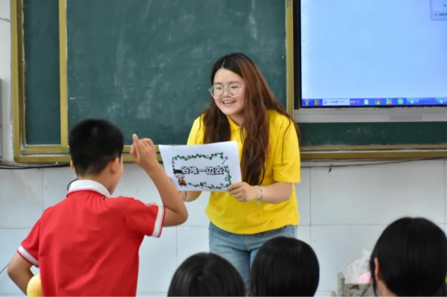 图为实践队员通过知识竞答,巩固孩子们的学习成果