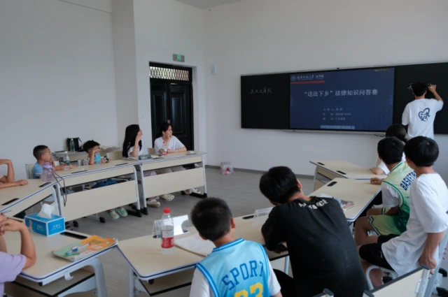 “法治小课堂”系列活动持续5天,涵盖“大学与法学”“刑法红绿灯”“家庭保护伞:法律如何保护未成年人?”“同住地球村”“网络安全教育,拒绝网络暴力”等五讲课程,涉及宪法、刑法、民法、未成年人保护法、国际法、网络安全法等多个领域,覆盖学生超过60人次。活动主要由实践团5名成员分别担任主讲人,通过课堂讲解、视频播放、游戏互动等形式,引导学生掌握基本的法律常识,提高法治素养,激发未成年人学法的积极性与主动性。学生们从最初的好奇观望,逐渐转变为专注倾听和踊跃互动。