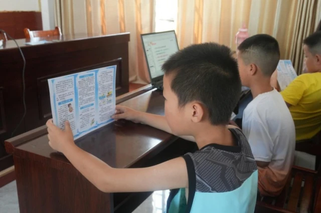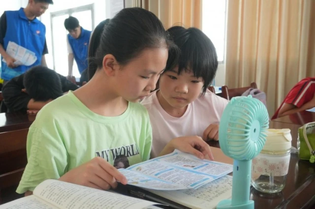 图为小朋友在志愿者的带领下阅读用电安全手册。湖北工业大学 杨思颖摄