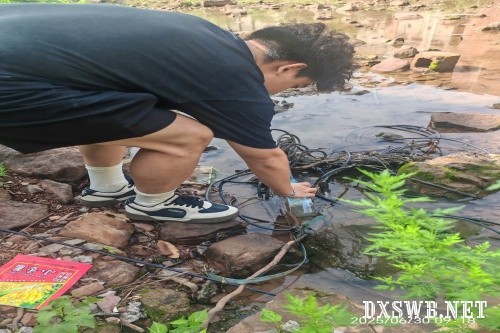图为贺俊霖于废弃化肥厂周边水域采集水样