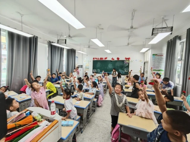 在高年级的课堂上,志愿者老师带领学生们挑战蝴蝶戒指。孩子们兴致勃勃地跟着老师的步骤,时而专注地弯折扭扭棒,时而相互交流想法,一个个栩栩如生的蝴蝶戒指在他们手中绽放。
