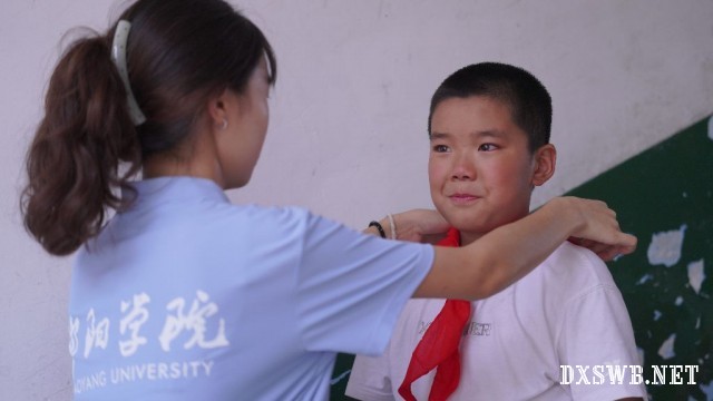 大学生网报7月11日讯(通讯员 杜邵枚),“青春志愿,普语启航”教育关爱服务团走进邵阳市大祥区板桥乡召伯村渡头桥中学,开展关爱留守儿童活动。活动现场,一位实践团成员为孩子庄重佩戴红领巾,温暖场景尽显育人初心。