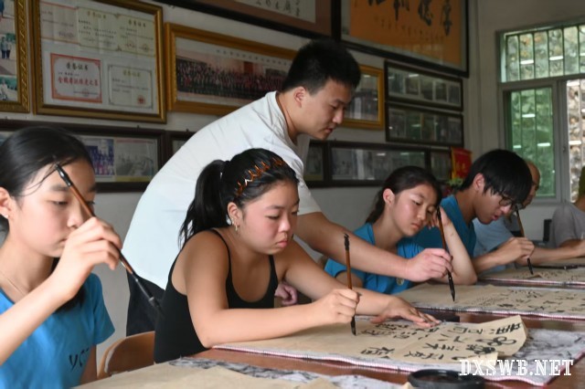 我们今日为同行的美国支教团安排了独特的一课。徐兴远老师教美国孩子学习了软笔书法。他先示范握笔姿势,再介绍隶书行笔的原理。“写‘横’要先顿笔,再匀速移动。”他逐个纠正姿势,握住孩子的手带他们感受运笔力度。练习几遍后,孩子们笔下的笔画逐渐平稳,虽然仍显稚嫩,却多了几分规整。有人举着自己的作品笑,眼里满是成就感。