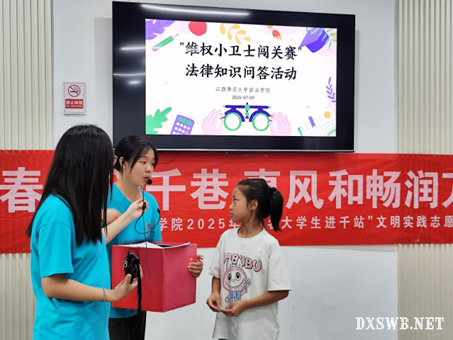 新时代文明实践站点作为学校与乡村沟通的桥梁,起着促进校地互补、力量汇聚的作用。队员们充分利用当地长征社区新时代文明实践站点的现有资源,针对未成年人保护问题,围绕乡村儿童成长过程中可能遇到的问题,开展了以未成年人保护、婚姻家庭、网络信息安全为主题的趣味课堂,通过动画演示、知识抢答等方式,让孩子们在轻松氛围中理解法律知识,增强自我保护能力与法治意识,助力法律知识融入日常生活、伴随成长。