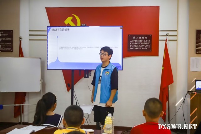 下午的课程聚焦 “磁场的相关联系与应用”。在 “电流与磁场” 部分,志愿者讲述了奥斯特的发现,并通过右手螺旋定则的演示,让孩子们了解电流与磁场的紧密联系,还举例电动机就是利用这一原理工作的。
