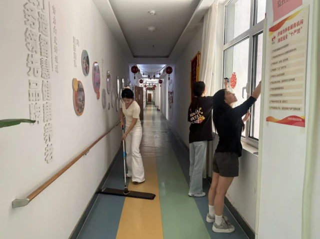 实践团成员迅速分工,拿起扫帚仔细清扫着养老院的每一个角落,从走廊到房间,不放过任何一处灰尘。