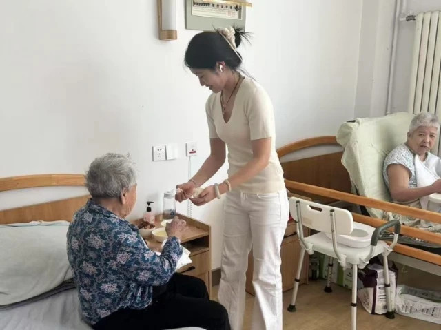 餐厅服务是实践活动的重点环节。每日午餐前,成员提前协助护理员摆放餐具,并依据老人饮食需求调整餐食软硬度。用餐期间,针对卧床或肢体活动不便无法自行进食的老人,成员会来到床边,半蹲在床旁耐心地为老人喂饭。