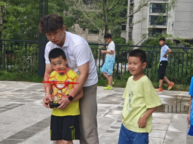飞机拼装与专业航拍:技能传承点亮匠心启蒙实践团特邀湖北工业职业技术学院无人机专业教师、湖北省技术能手王典老师加盟,以“专业引领+匠心实践”开启深度体验:教师携工业级设备讲解“航点规划”等技术,指导孩子们操控航拍无人机,通过“空中社区”画面,让小朋友切身体会科技的魅力;志愿者带领木质电动飞机拼装,从识图纸到拼装,以“机翼重心如鸟儿羽毛”类比空气动力学,孩子们在试飞修复中感受探索精神,现场“航空知识角”更传承湖北航空先驱故事。教师称此举旨在种下“科技严谨性” 与“手工温度感”种子,筑牢技能人才认知根基。
