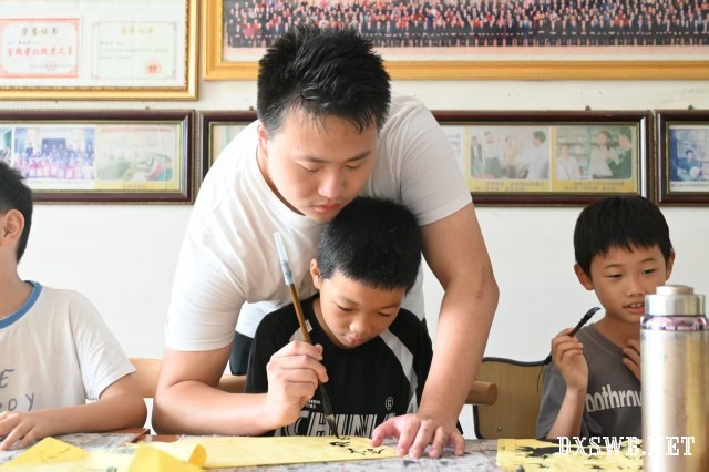 "小朋友们,今天我们一起来学习毛笔字。"徐兴远老师的声音温和而有力,嘴角挂着浅浅的微笑。孩子们立刻挺直了腰板,黑亮的眼睛齐刷刷地望向他。老师先示范握笔姿势,右手拇指和食指轻轻捏住笔杆,中指抵住笔腹,无名指和小指自然弯曲。他边讲解边做动作,手腕灵活地转动,笔尖在宣纸上划出优美的弧线。"看,这样握笔才稳。"他俯身指导时,指尖轻轻调整孩子的手指,如同春风拂过新芽。教室里只有毛笔摩擦宣纸的沙沙声,老师额头上渗出的细密汗珠,映照着他对教学的专注。当看到有一个小男孩写出漂亮的一笔时,老师眼中闪过惊喜,轻拍学生肩膀,传递着无声的鼓励。