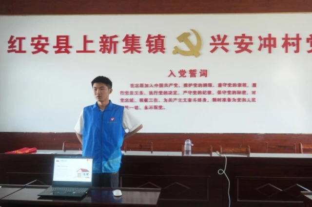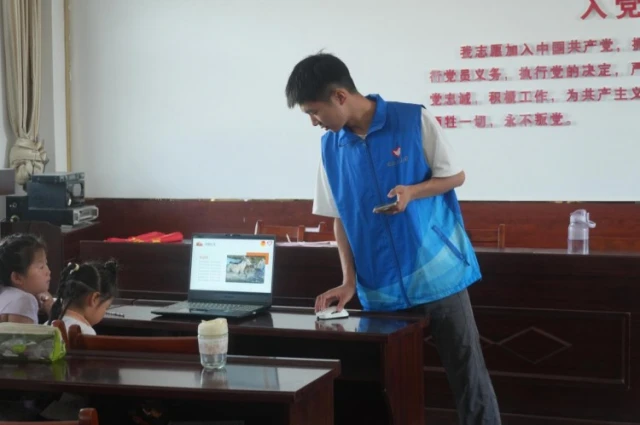 图为湖北工业大学志愿者在播放课件。湖北工业大学 杨思颖摄