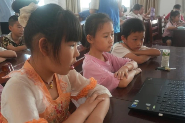图为湖北工业大学志愿者给小朋友播放厨房安全课件。湖北工业大学杨思颖摄