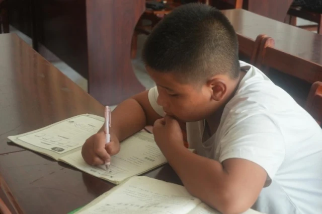 图为小朋友在记笔记。湖北工业大学 杨思颖摄