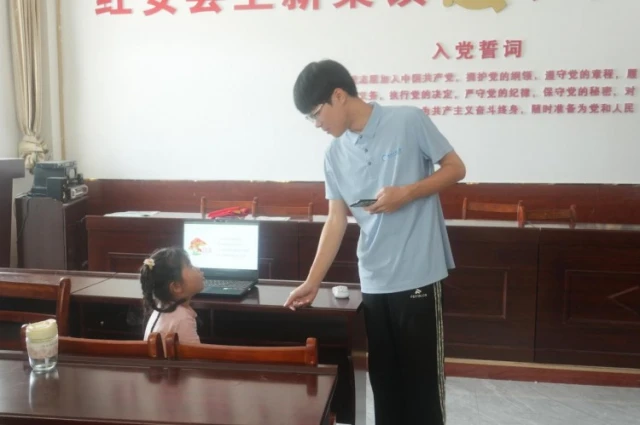 图为湖北工业大学志愿者给小朋友播放毒蘑菇视频。湖北工业大学 杨思颖摄