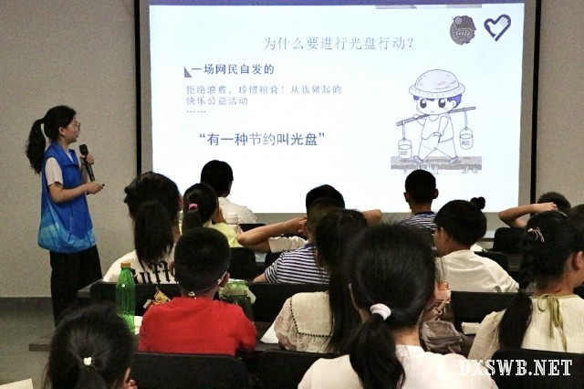 图为志愿者在为小朋友们讲解光盘行动。湖北工业大学